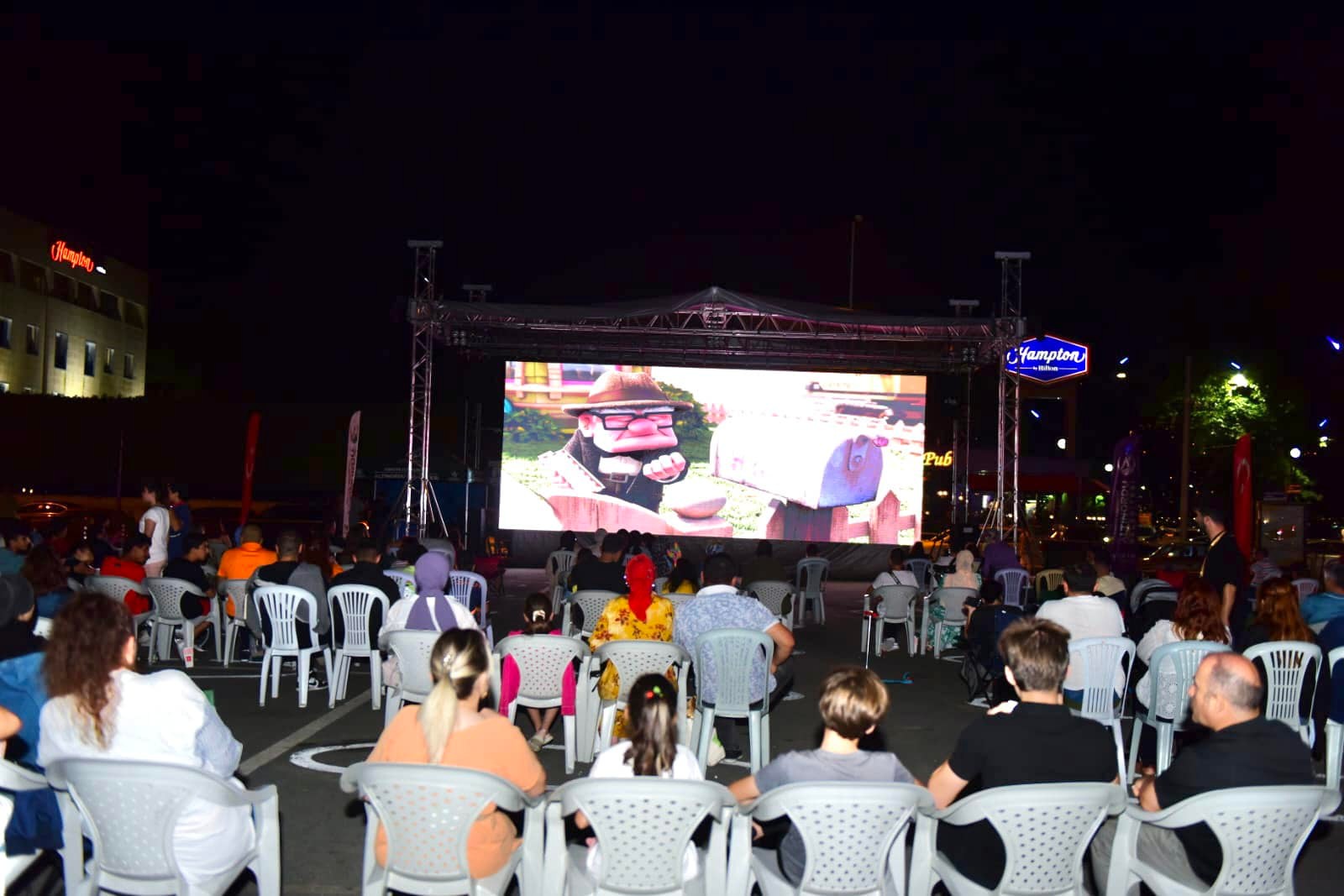 Açık hava Sinemasında animasyonun her yaştan izleyiciye hitap ettiği gerçeğini bir kez daha kanıtlayan en iyi animasyon Oscar’ı ödüllü “Yukarı Bak” film gösterimine ailece katılan vatandaşlar Altınordu Belediyesinin ikramları eşliğinde yıldızlar altında sinema keyfi yaşadılar. Altınordu Belediyesinin Akyazı sahilinde bulunan ücretsiz oto park alanına minderleriyle gelen sinemaseverler sahilin serin esintileri eşliğinde sevdikleriyle birlikte hoşça vakit geçirdiler.